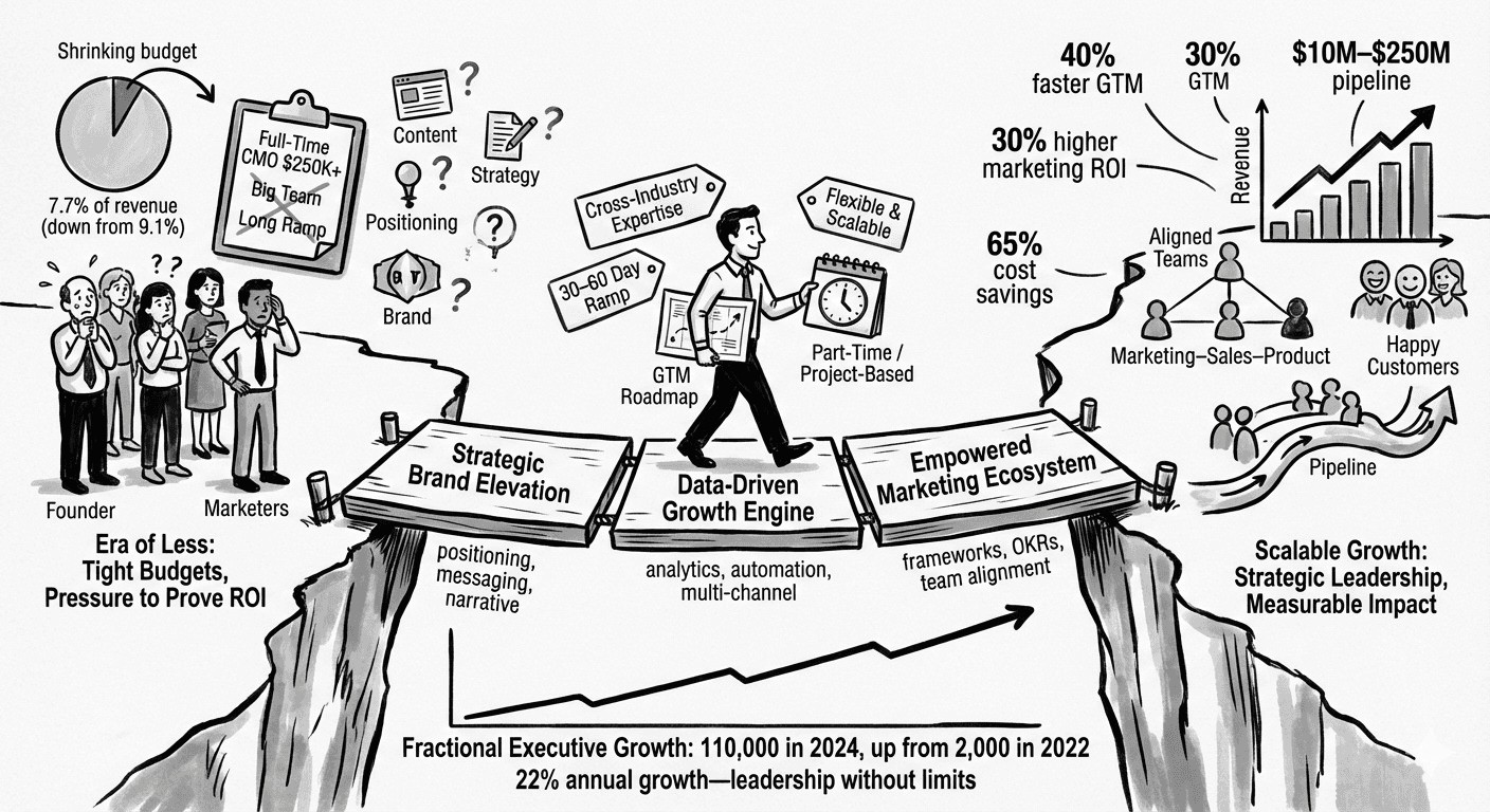 Marketing leadership used to mean full-time offices, big teams, and even bigger budgets. Today, it means clarity, accountability, and impact — delivered at scale.